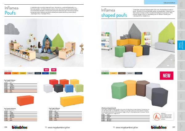 Inflamea pentagonal poufs Comfortable , pentagonal-shaped pouffes in five colors . The black feet are made of plastic . The poufs are covered with high-quality , very durable fabric . Thanks to its very high resistance to stains and dirt , it is perfect for kindergartens and schools . 100 % polyester . Weight : 476 g / m . Flammability class : B1 . Abrasion : 96,000 cycles . • side length 30 cm • height 42 cm 101891 green 101892 mustard 101893 brown 101894 light grey 101895 dark grey