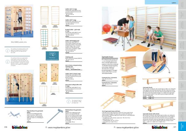 Gymnastic bench Benches made of softwood , with wooden legs on rubber , non-soiling feet . Steel supports , that link bench elements , bone the construction and ensure stability and security . All boards , beams and legs edges are rounded . Bench has a hook that enables hanging it on a ladder , bar or gymnastic box . Bench beam ( width : 10 cm ) can be used as a balance beam after turning it upside down . 026001 lenght : 2 m 026002 lenght : 3 m