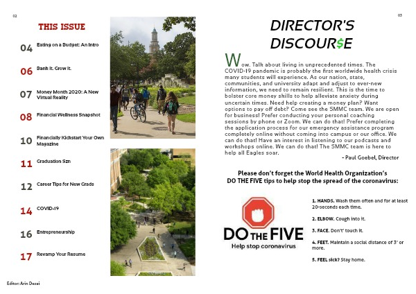 ow. Talk about living in unprecedented times. The COVID-19 pandemic is probably the first worldwide health crisis many students will experience. As our nation, state, communities, and university adapt and adjust to ever-new information, we need to remain resilient. This is the time to bolster core money skills to help alleviate anxiety during uncertain times. Need help creating a money plan? Want options to pay off debt? Come see the SMMC team. We are open for business! Prefer conducting your personal coaching sessions by phone or Zoom. We can do that! Prefer completing the application process for our emergency assistance program completely online without coming into campus or our office. We can do that! Have an interest in listening to our podcasts and workshops online. We can do that! The SMMC team is here to help all Eagles soar.