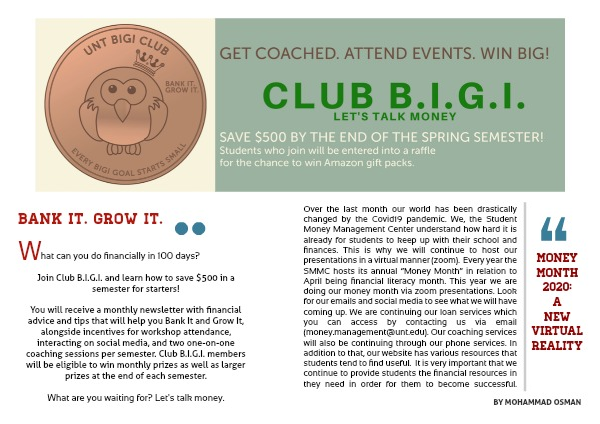 You will receive a monthly newsletter with financial advice and tips that will help you Bank It and Grow It, alongside incentives for workshop attendance, interacting on social media, and two one-on-one coaching sessions per semester. Club B.I.G.I. members will be eligible to win monthly prizes as well as larger prizes at the end of each semester.
