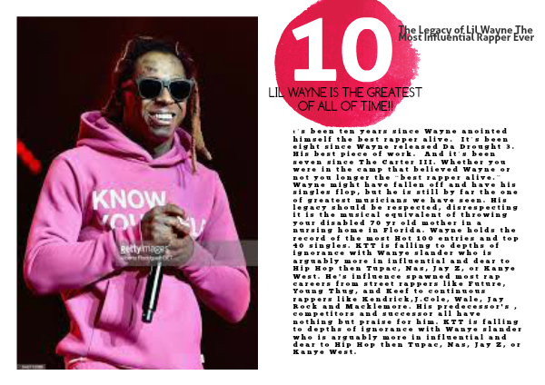 t’s been ten years since Wayne anointed himself the best rapper alive. It’s been eight since Wayne released Da Drought 3. His best piece of work. And it’s been seven since The Carter III. Whether you were in the camp that believed Wayne or not you longer the “best rapper alive.” Wayne might have fallen off and have his singles flop, but he is still by far the one of greatest musicians we have seen. His legacy should be respected, disrespecting it is the musical equivalent of throwing your disabled 70 yr old mother in a nursing home in Florida. Wayne holds the record of the most Hot 100 entries and top 40 singles. KTT is falling to depths of ignorance with Wanye slander who is arguably more in influential and dear to Hip Hop then Tupac, Nas, Jay Z, or Kanye West. He's influence spawned most rap careers from street rappers like Future, Young Thug, and Keef to continuous rappers like Kendrick,J.Cole, Wale, Jay Rock and Macklemore. His predecessor's , competitors and successor all have nothing but praise for him. KTT is falling to depths of ignorance with Wanye slander who is arguably more in influential and dear to Hip Hop then Tupac, Nas, Jay Z, or Kanye West.