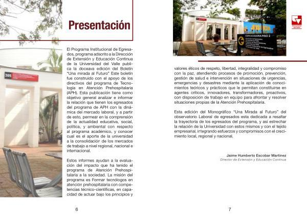 El Programa Institucional de Egresados , programa adscrito a la Dirección de Extensión y Educación Continua de la Universidad del Valle publica la doceava edición del Boletín “ Una mirada al Futuro ” Este boletín fue construido con el apoyo de los directivos del programa de Tecnología en Atención Prehospitalaria ( APH ). Esta publicación tiene como objetivo general analizar e informar la relación que tienen los egresados del programa de APH con la dinámica del mercado laboral , y a partir de esto , permear en la comprensión de la actualidad educativa , social , política , y ambiental con respecto al programa académico , y conocer cual es el aporte de la universidad a la consolidación de los mercados de trabajo a nivel regional , nacional e internacional .