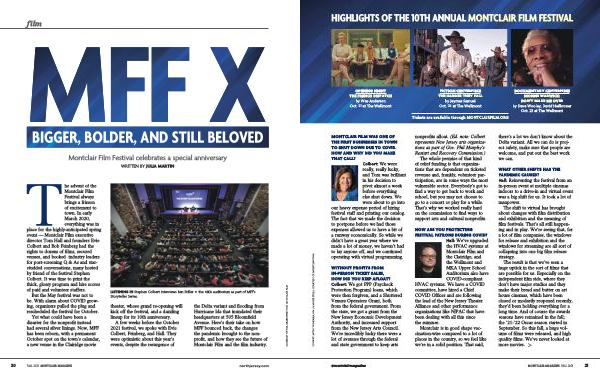 MONTCLAIR FILM WAS ONE OF THE FIRST BUSINESSES IN TOWN TO SHUT DOWN DUE TO COVID . HOWAND WHY DID YOUMAKE THATCALL ? Colbert : We were really , really lucky , and Tom was brilliant in his decision to pivot almost aweek before everything else shut down . We were about to go into our heavy expense period of hiring festival staff and printing our catalog . The fact that we made the decision to postpone before we had those expenses allowed us to have a bit of a runway economically . So while we didn ’ t have a great year where we made alot of money , we haven ’ thad to lay anyone off , and we continued operating with virtual programming . |