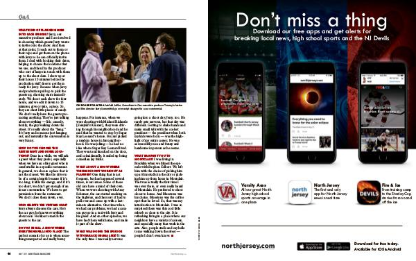 WHAT BROUGHT YOU TO MONTCLAIR? I was living in Brooklyn when we filmed the episode with Stephen Colbert. We left him with the choice of picking him up at this studio inthe city or picking him up from home in Montclair. That was actually the first time I was ever there, or even really heard of Montclair. He preferred to shoot closer to home. And Bluestone was his choice. Bluestone was the coffee spot that he loved. So, that was my introduction to Montclair. I was so surprised there was this cool little suburb so close to the city. It is refreshing living in a place where our neighbors have a variety of careers, and especially many that work in the arts. Also, people smile and say hello to me walking down the street— people Idon’ t even know. ■