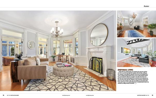 ( Opposite ) The s�uarish living room between the sunroom and fam� ily room is aspot for spending time together with the kids , working at the computer overlooking the e�pansive front porch and rela�ing with a book . An anti�ue sewing machine rests on the wooden furniture behind the couch . ( Top ) The staircase is locatedtothe left of the front door and foyer ; the homeowners painted the woodwork in the entryway , too . The color above the chair rail continues to the second �oor . ( Above ) The great room , part of which is seen here , was added on to the back of the house , and is opentothe casualdining area . An industrial�style trestle runs beneath the ceiling towards the kitchen .