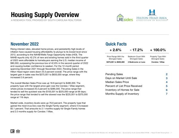 Rising interest rates , elevated home prices , and persistently high levels of inflation have caused housing affordability to plunge to its lowest level since 2012 , according to the NAHB / Wells Fargo Opportunity Index ( HOI ). The NAHB reports only 42.2 % of new and existing homes sold in the third quarter of 2022 were affordable to homebuyers earning the U . S . median income of $ 90,000 , surpassing the previous low of 42.8 % in the second quarter of 2022 and causing builder confidence to weaken . For the 12-month period spanning December 2021 through November 2022 , Pending Sales in the Hilton Head region were down 23.3 percent overall . The price range with the largest gain in sales was the $ 375,001 to $ 650,000 range , where they increased 2.6 percent .