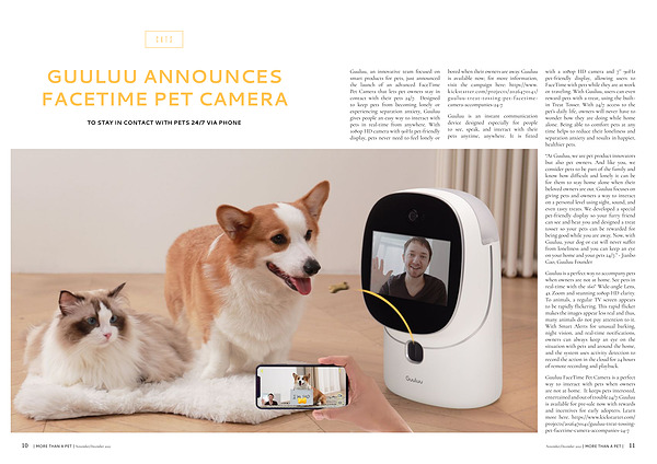 Guuluu , an innovative team focused on smart products for pets , just announced the launch of an advanced FaceTime Pet Camera that lets pet owners stay in contact with their pets 24 / 7 . Designed to keep pets from becoming lonely or experiencing separation anxiety , Guuluu gives people an easy way to interact with pets in real-time from anywhere . With 1080p HD camera with 90Hz pet-friendly display , pets never need to feel lonely or bored when their owners are away . Guuluu is available now ; for more information , visit the campaign here : https :// www . kickstarter . com / projects / 2026470141 / guuluu-treat-tossing-pet-facetimecamera-accompanies-24-7