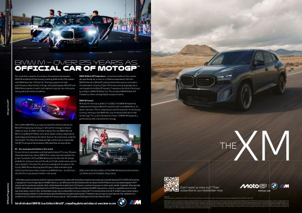 For more than a quarter of a century , the partnership between BMW M and MotoGP has thrived , marking 2025 as the 27th season with BMW M as the “ Official Car .” Sharing a passion for highperformance , advanced technology , and global appeal , MotoGP and BMW M are a perfect match , both epitomizing top-tier motorcycle racing and automotive excellence .