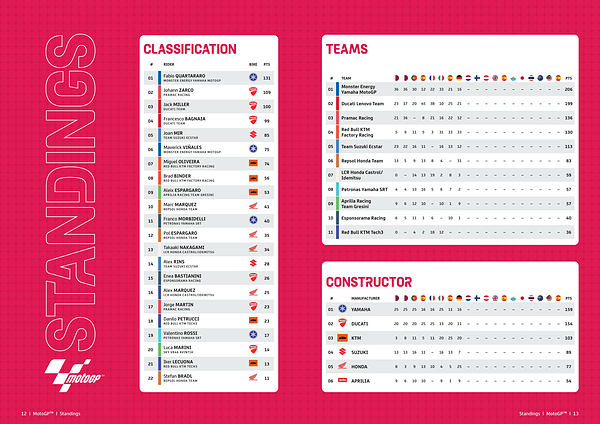 02 Ducati Lenovo Team 23 17 20 45 38 10 25 21 – – – – – – – – – – – 199