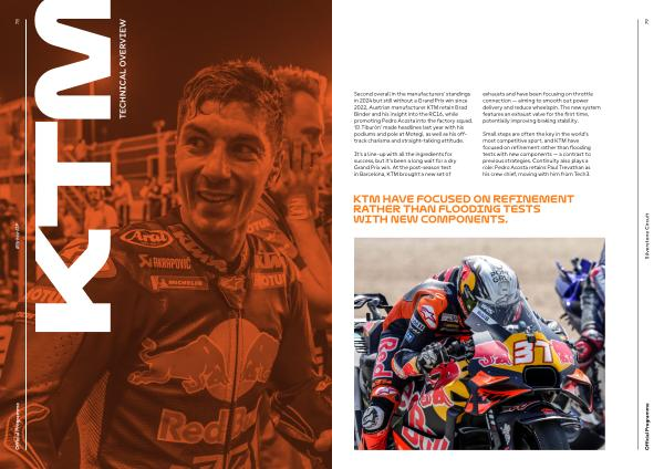 It’ s a line-up with all the ingredients for success, but it’ s been a long wait for a dry Grand Prix win. At the post-season test in Barcelona, KTM brought a new set of exhausts and have been focusing on throttle connection— aiming to smooth out power delivery and reduce wheelspin. The new system features an exhaust valve for the first time, potentially improving braking stability.
