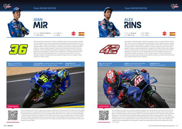 Desde sus primeras incursiones en la escena mundialista , estaba claro que Mir estaba destinado a la cima . Nadie en la era moderna ha dominado la clase ligera de los Grandes Premios como lo hizo Mir en 2017 , su segunda temporada en la categoría . Diez victorias en carreras y la conquista del título de Moto3™ fueron solo el comienzo . Sus primeras actuaciones en el equipo Marc VDS de Moto2™ -podios en Le Mans y Mugello- convencieron a Suzuki para incorporarlo a sus filas de MotoGP™ en 2019 . Mir explotó por completo en 2020 para conseguir uno de los títulos más inesperados del campeonato en la historia de la categoría reina . Su defensa del título fue más difícil , ya que Suzuki cedió demasiado terreno a sus rivales en el desarrollo de la moto . Sin embargo , su habitual consistencia bastó para que Mir terminara tercero en la general . ¿ Podrá recuperar su corona en 2022 ?