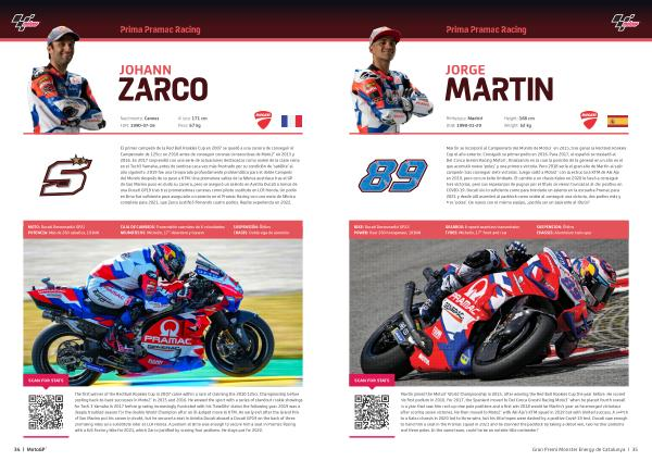 El primer campeón de la Red Bull Rookies Cup en 2007 se quedó a una carrera de conseguir el Campeonato de 125cc en 2010 antes de conseguir coronas consecutivas de Moto2™ en 2015 y 2016 . En 2017 sorprendió con una serie de actuaciones destacadas como rookie de la clase reina en el Tech3 Yamaha , antes de sentirse cada vez más frustrado por su condición de ‘ satélite ’ al año siguiente . 2019 fue una temporada profundamente problemática para el doble Campeón del Mundo después de su paso a KTM . Una prematura salida de la fábrica austriaca tras el GP de San Marino puso en duda su carrera , pero se aseguró un asiento en Avintia Ducati a lomos de una Ducati GP19 tras tres prometedoras carreras como piloto sustituto en LCR Honda . Un podio en Brno fue suficiente para asegurarle un asiento en el Pramac Racing con una moto de fábrica completa para 2021 , que Zarco justificó firmando cuatro podios . Repite experiencia en 2022 .