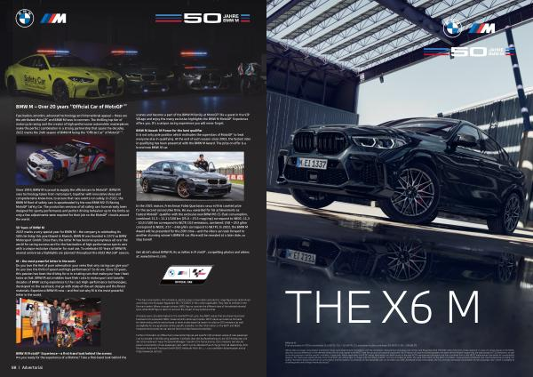 Fascination , emotion , advanced technology and international appeal – these are the attributes MotoGP™ and BMW M have in common . The thrilling top tier of motorcycle racing and the creator of high-performance automobile masterpieces make the perfect combination in a strong partnership that spans the decades . 2022 marks the 24th season of BMW M being the “ Official Car ” of MotoGP™ ”.