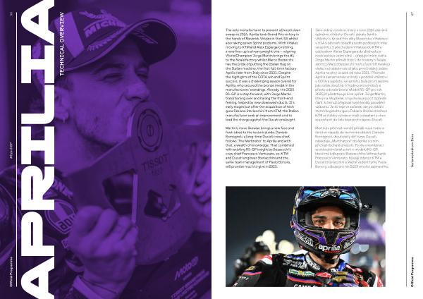Jako jediný výrobce, který v roce 2024 zabránil úplnému vítězství Ducati, získala Aprilia vítězství v Grand Prix díky Mavericku Viñalesovi v USA a zároveň obsadila sedm pódiových míst ve sprintu. S přechodem Viñalese do KTM a odchodem Aleixe Espargara do důchodu je nová sestava velmi silná – úřadující mistr světa Jorge Martín přináší číslo 1 do továrny v Noale, zatímco Marco Bezzecchi má tu čest mít italskou vlajku na italském stroji jako první italský jezdec Aprilia na plný úvazek od roku 2021. Přestože Aprilia zaznamenala vrcholy v podobě vítězství v COTA a úspěchu ve sprintu, byla pro ni sezóna jako celek náročná. V hodnocení výrobců si přesto odvezla bronz. Model RS-GP pro rok 2025 již představuje krok vpřed. Jorge Martin, který na něj přešel, si vychvaluje pocit z přední části, k čemuž přispívají nové kanály proudění vzduchu. Je to teprve začátek, ale po získání technologického guru Fabiana Sterlacchiniho z KTM se italský výrobce snaží o zlepšení a chce se postavit do čela boje proti náporu Ducati.