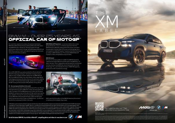 For more than a quarter of a century, the partnership between BMW M and MotoGP has thrived, marking 2025 as the 27th season with BMW M as the“ Official Car.” Sharing a passion for highperformance, advanced technology, and global appeal, MotoGP and BMW M are a perfect match, both epitomizing top-tier motorcycle racing and automotive excellence.