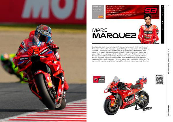 Does Marc Marquez need an introduction? He arrived with a bang in 2013, rewrote some history, set out his stall as one side of a sport-defining rivalry and wrote some more history. And then it suddenly all changed and an arm injury threatened to end his career. But it didn’ t. He came back, rolled the dice again on a switch to an Independent Team and a year-old Ducati, and came out swinging in 2024. He won again. And now he’ s moving to the factory squad alongside Francesco Bagnaia. We’ ve already seen fireworks between the two. We’ ve also seen some truly incredible racing. As we said of Bagnaia, whatever happens, a close rivalry only proves the quality of each rider. For Marquez it’ s also chance at a crown with a second manufacturer – something not many have ever achieved. Game on.