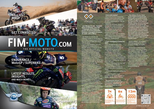 Two Wheels for Life criou um movimento global no mundo desporto motorizado , de apoio a implementação de programas de saúde , que salvam vidas em África . Sendo o único desporto com uma instituição de caridade oficial , a MotoGP™ oferece a sua ajuda , há mais de trinta anos para garantir que a saúde chega a pessoas vulneráveis . Atualmente operando em quatro países africanos : Gâmbia , Nigéria , Malawi e Lesoto , os programas são executados pela organização Riders for Health ( Riders ), cujos únicos sistemas garantem que os veículos dos trabalhadores da saúde são executados de forma viável , dia após dia . Mobilizados por motas e outros veículos , os enfermeiros , médicos e outros profissionais de saúde podem promover medidas educativas e preventivas para coibir a propagação de doenças , auxiliar as mulheres no trabalho de parto , imunizar recémnascidos e diagnosticar doenças . Com transporte confiável , eles podem chegar às aldeias para cuidar de bebés , crianças e idosos , e os resultados dos exames podem ser levados aos laboratórios e devolvidos rapidamente para rápido diagnóstico de doenças . O Two Wheels for Life realiza incríveis leilões e eventos com a ajuda dos pilotos e equipas do MotoGP™ . Embora o COVID-19 tenha dificultado a captação de recursos , com o apoio da comunidade do motociclismo , o Two Wheels for Life conseguiu ajudar os cinco programas do Riders for Health e a prestar cuidados vitais às suas comunidades num momento , em que foi necessário mais do que nunca .