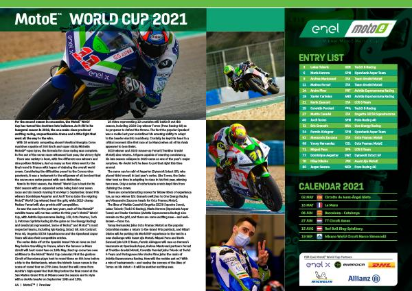 18 riders representing 10 countries will battle it out this season , including 2020 Cup winner Torres ( Pons Racing 40 ) as he prepares to defend the throne . The fact the popular Spaniard was a rookie last year underlined his amazing ability to adapt to the heavier electric machinery . Crucially he kept his head in a critical moment ( the first race at Le Mans ) when all of his rivals appeared to lose theirs . 2019 winner and 2020 runner-up Ferrari ( Trentino Gresini MotoE ) also returns . A figure capable of unerring consistency , his late season collapse in 2020 came as one of the year ’ s major surprises . No doubt he ’ ll be keen to put that right this time around . The same can be said of Aegerter ( Dynavolt Intact GP ), who placed third overall in last year ’ s series . Like Torres , the Swiss rider took no time in adapting to class in his first year , winning two races . Only a series of unfortunate events kept him from claiming the crown . There are some interesting moves for fellow riders of experience too , as race winner Eric Granado switches to One Energy Racing and Alessandro Zaccone heads for Octo Pramac MotoE . The likes of Mattia Casadei ( Ongetta SIC58 Squadra Corse ), Lukas Tulovic ( Tech3 E-Racing ), Maria Herrera ( Openbank Aspar Team ) and Xavier Cardelus ( Avintia Esponsorama Racing ) also remain on the grid , and there are some exciting new – and wellknown – faces too . Yonny Hernandez joins Octo Pramac MotoE as the popular Colombian makes a return to the Grand Prix paddock , and Hikari Okubo will be putting his WorldSSP experience to the test in a new challenge with Avant Ajo MotoE . Miquel Pons and Kevin Zannoni join LCR E-Team , Fermin Aldeguer will race as Herrera ’ s teammate at Openbank Aspar , Andrea Mantovani partners Ferrari at Trentino Gresini MotoE , Corentin Perolari joins Tulovic at Tech3 E-Team and Portuguese rider Andre Pires joins the ranks of Avintia Esponsorama Racing . How will the rookies get on ? With a mix of backgrounds – and seeing the success of the likes of Torres on his debut – it will be another exciting year .