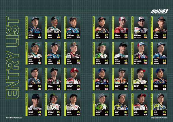 PETRONAS SPRINTA RACING Darryn BINDER 40 BIKE : Honda RED BULL KTM TECH 3 Deniz ONCU 53 BIKE : KTM CIP GREEN POWER Kaito TOBA 27 BIKE : KTM CIP GREEN POWER Maximilian KOFFLER 73 BIKE : KTM LEOPARD RACING Xavier ARTIGAS 43 BIKE : Honda BOE OWLRIDE Riccardo ROSSI 54 BIKE : KTM GASGASGAVIOTA ASPAR Izan GUEVARA 28 BIKE : Gas Gas BOE OWLRIDE Stefano NEPA 82 BIKE : KTM CARXPERT PRUESTELGP Jason DUPASQUIER 50 BIKE : KTM STERILGARDA MAX RACING TEAM Romano FENATI 55 BIKE : Husqvarna STERILGARDA MAX RACING TEAM Adrian FERNANDEZ 31 BIKE : Husqvarna HONDA TEAM ASIA Yuki KUNII 92 BIKE : Honda INDONESIAN GRESINI RACING Moto3 Jeremy ALCOBA 52 BIKE : Honda RED BULL KTM TECH 3 Ayumu SASAKI 71 BIKE : KTM RED BULL KTM AJO Pedro ACOSTA 37 BIKE : KTM AVINTIA ESPONSORAMA Moto3 Carlos TATAY 99 BIKE : KTM Entry List | Moto3 TM | 55