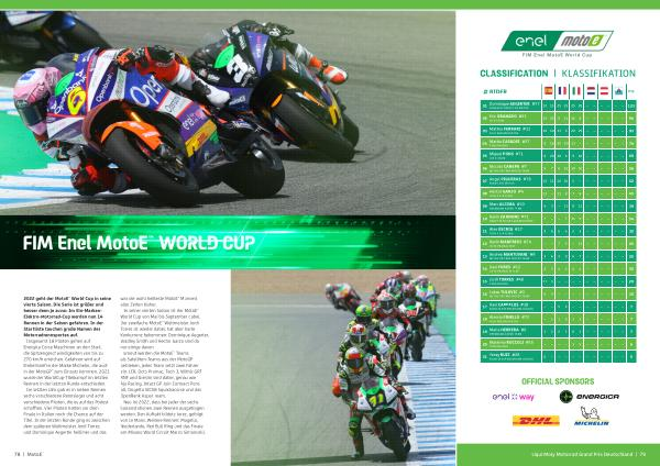 2022 geht der MotoE™ World Cup in seine vierte Saison . Die Serie ist größer und besser denn je zuvor . Im Ein-Marken- Elektro-Motorrad-Cup werden nun 14 Rennen in der Saison gefahren . In der Startliste tauchen große Namen des Motorradrennsportes auf . Insgesamt 18 Piloten gehen auf Energica Corse Maschinen an den Start , die Spitzengeschwindigkeiten von bis zu 270 km / h erreichen . Gefahren wird auf Einheitsreifen der Marke Michelin , die auch in der MotoGP™ zum Einsatz kommen . 2021 wurde der WorldCup-Titelkampf im letzten Rennen in der letzten Runde entschieden . Im letzten Jahr gab es in sieben Rennen sechs verschiedene Rennsieger und acht verschiedene Piloten , die es auf das Podest schafften . Vier Piloten hatten vor dem Finale in Italien noch die Chance auf den Titel . In der letzten Runde ging es zwischen dem späteren Weltmeister Jordi Torres und Dominique Aegerter heiß her und das war der wohl heißeste MotoE™ Moment aller Zeiten bisher . In seiner vierten Saison ist der MotoE™ World Cup von Mai bis September dabei . Der zweifache MotoE™ Weltmeister Jordi Torres ist wieder dabei , hat aber harte Konkurrenz bekommen : Dominique Aegerter , Bradley Smith und Hector Garzo sind da nur einige davon . Erneut werden die MotoE™ Teams als Satelliten-Teams aus der MotoGP betrieben , jedes Team setzt zwei Fahrer ein : LCR , Octo Pramac , Tech 3 , WithU GRT RNF und Gresini sind dabei , genau wie Ajo Racing , Intact GP , Join Contract Pons 40 , Ongetta SIC58 Squadracorse und das OpenBank Aspar Team . Neu ist 2022 , dass bei jeder der sechs Saisonstationen zwei Rennen ausgetragen werden . Den Auftakt bildete Jerez , gefolgt von Le Mans . Weitere Rennen : Mugello , Niederlande , Red Bull Ring und das Finale am Misano World Circuit Marco Simoncelli .