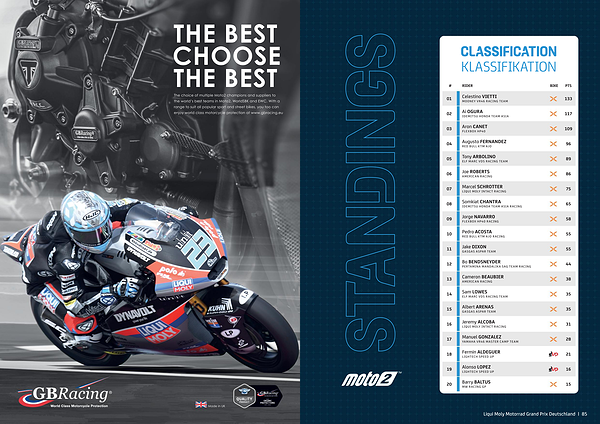 The choice of multiple Moto2 champions and suppliers to the world ’ s best teams in Moto2 , WorldSBK and EWC . With a range to suit all popular sport and street bikes , you too can enjoy world class motorcycle protection at www . gbracing . eu