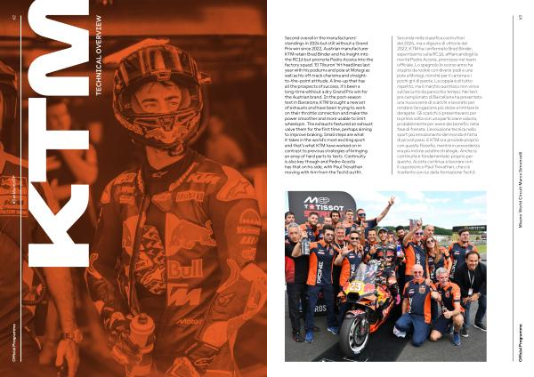 Second overall in the manufacturers’ standings in 2024 but still without a Grand Prix win since 2022, Austrian manufacturer KTM retain Brad Binder and his insight into the RC16 but promote Pedro Acosta into the factory squad.‘ El Tiburon’ hit headlines last year with his podiums and pole at Motegi as well as his off-track charisma and straightto-the-point attitude. A line-up that has all the prospects of success, it’ s been a long-time without a dry Grand Prix win for the Austrian brand. In the post-season test in Barcelona, KTM brought a new set of exhausts and have been trying to work on their throttle connection and make the power smoother and more usable to limit wheelspin. The exhausts featured an exhaust valve them for the first time, perhaps aiming to improve braking. Small steps are what it takes in the world’ s most exciting sport and that’ s what KTM have worked on in contrast to previous strategies of bringing an array of hard parts to tests. Continuity is also key though and Pedro Acosta has that on his side, with Paul Trevathan moving with him from the Tech3 outfit.