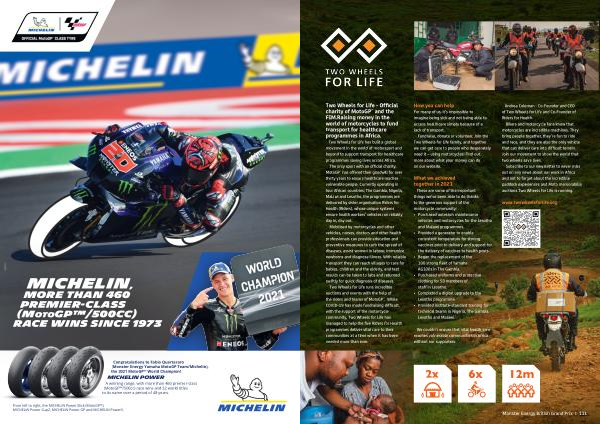 Two Wheels for Life runs incredible auctions and events with the help of the riders and teams of MotoGP™ . While COVID-19 has made fundraising difficult , with the support of the motorcycle community , Two Wheels for Life has managed to help the five Riders for Health programmes deliver vital care to their communities at a time when it has been needed more than ever .