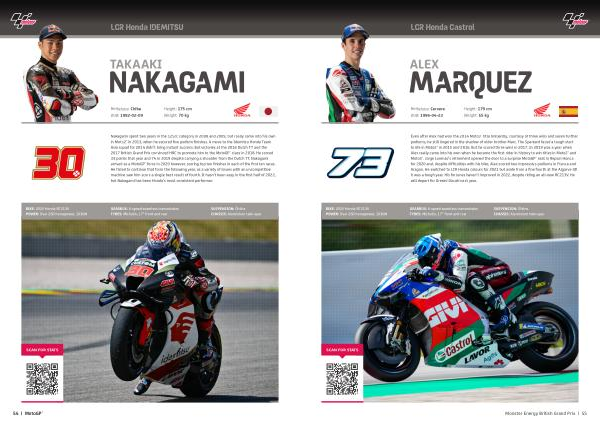 Nakagami spent two years in the 125cc category in 2008 and 2009 , but really came into his own in Moto2™ in 2013 , when he secured five podium finishes . A move to the Idemitsu Honda Team Asia squad for 2014 didn ’ t bring instant success . But victories at the 2016 Dutch TT and the 2017 British Grand Prix convinced HRC to promote him to the MotoGP™ class in 2018 . He scored 33 points that year and 74 in 2019 despite carrying a shoulder from the Dutch TT . Nakagami arrived as a MotoGP™ force in 2020 however , scoring top ten finishes in each of the first ten races . He failed to continue that form the following year , as a variety of issues with an uncompetitive machine saw him score a single best result of fourth . It hasn ’ t been easy in the first half of 2022 , but Nakagami has been Honda ’ s most consistent performer .
