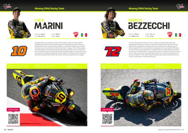 A full-time debut arrived for Bezzecchi in 2017 , when he contested the year aboard the underpowered CIP Mahindra machine . He moved to the PruestelGP KTM squad for 2018 and fought for the championship , scoring three wins and six further podiums along the way . He endured a baptism of fire in his rookie Moto2™ campaign aboard an uncompetitive KTM chassis , but a switch to the Sky Racing VR46 team and Kalex hardware for 2020 resulted in two Moto2™ race wins and four further podiums . He was expected to kick on and fight for the title in the same set-up in 2021 , but that never quite materialised , despite one race win and seven podiums . He moved up to MotoGP™ in 2022 with Mooney VR46 Racing Team aboard a Ducati GP21 and is on course to end the season as the Rookie of the Year .