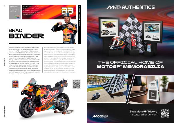 Brad Binder destacó en la Red Bull MotoGP Rookies Cup antes de dar el salto a Moto3™ a tiempo completo. Sus primeros podios llegaron en 2014, antes de su paso decisivo a Red Bull KTM Ajo. La alianza dio sus frutos con el título mundial de Moto3™ en 2016, sellado con una actuación dominante en Aragón. El salto a Moto2™ trajo una progresión constante, con un fuerte final en 2017 y una lucha por el título en 2019, donde se quedó cerca pese a cinco victorias en el tramo final. Su llegada a MotoGP™ en 2020 tuvo impacto inmediato. Su victoria en Brno marcó un logro destacado como rookie y definió su trayectoria en la categoría reina. El éxito continuó con un espectacular triunfo en mojado en 2021. Su regularidad en cabeza y estilo agresivo marcaron las temporadas siguientes, incluido un cuarto puesto en 2023. Tras un 2025 más discreto, Binder afronta 2026 con Red Bull KTM Factory Racing con el objetivo de volver a luchar por el podio de forma constante.