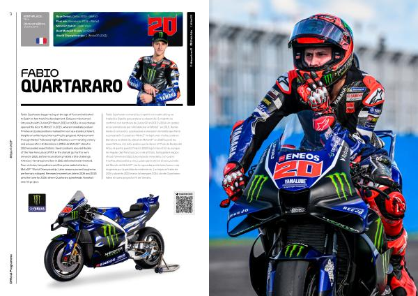 Fabio Quartararo comenzó a competir con cuatro años y se trasladó a España para acelerar su desarrollo. Su talento se confirmó con los títulos de JuniorGP en 2013 y 2014. Un cambio en la normativa le permitió debutar en Moto3™ en 2015, donde destacó con podios y poles pese a una lesión de tobillo que frenó su progresión. Su paso por Moto2™ incluyó una victoria y pole en Barcelona en 2018. Su debut en MotoGP™ en 2019 superó las expectativas, con siete podios que le dieron el título de Rookie del Año y el quinto puesto final. En 2020 logró más victorias, aunque la irregularidad frenó sus opciones al título. Su llegada al equipo oficial Yamaha en 2021 tuvo impacto inmediato, con cuatro triunfos, diez podios y cinco poles que le dieron el Campeonato del Mundo de MotoGP™. Las temporadas posteriores fueron más exigentes por la pérdida de rendimiento. La mejora a finales de 2024 y durante 2025 marca la base para 2026, donde Quartararo lidera el nuevo proyecto V4 de Yamaha.