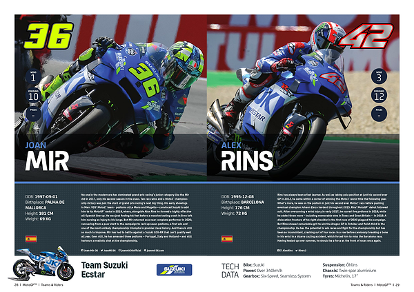 No one in the modern era has dominated grand prix racing ’ s junior category like the Mir did in 2017 , only his second season in the class . Ten race wins and a Moto3™ championship victory was just the start of grand prix racing ’ s next big thing . His early showings in Marc VDS ’ Moto2™ team - podiums at Le Mans and Mugello – convinced Suzuki to add him to its MotoGP™ ranks in 2019 , where , alongside Alex Rins he formed a highly effective all-Spanish line-up . He was just finding his feet before a massive testing crash in Brno left him nursing an injury to his lungs . But Mir returned as a near complete performer in 2020 , recovering from a poor start to the campaign to rack up seven podiums , a first win and one of the most unlikely championship triumphs in premier class history . And there is still so much to improve . Mir has had to battle against a Suzuki GSX-RR that can ’ t qualify well all year . Even still , he has amassed three podiums – Portugal , Italy and Holland – and still harbours a realistic shot at the championship .