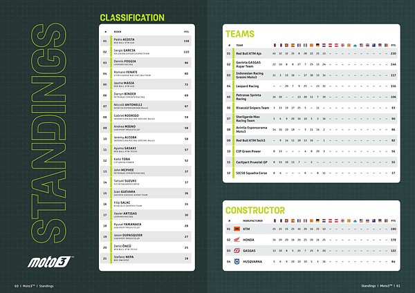 RIDER RIDER PTS PTS 01 Pedro ACOSTA RED BULL KTM AJO 158 02 Sergio GARCIA SOLUNION GASGAS ASPAR TEAM 110 03 Dennis FOGGIA LEOPARD RACING 86 04 Romano FENATI STERILGARDA MAX RACING TEAM 80 05 Jaume MASIA RED BULL KTM AJO 72 06 Darryn BINDER PETRONAS SPRINTA RACING 69 07 Niccolò ANTONELLI AVINTIA ESPONSORAMA Moto3 67 08 Gabriel RODRIGO INDONESIAN RACING GRESINI Moto3 59 09 Andrea MIGNO CARXPERT PRUESTELGP 58 10 Jeremy ALCOBA INDONESIAN RACING GRESINI Moto3 58 11 Ayumu SASAKI RED BULL KTM TECH3 57 12 Kaito TOBA CIP GREEN POWER 52 13 John MCPHEE PETRONAS SPRINTA RACING 37 14 Tatsuki SUZUKI SIC58 SQUADRA CORSE 37 15 Izan GUEVARA GAVIOTA GASGAS ASPAR TEAM 36 16 Filip SALAC RIVACOLD SNIPERS TEAM 35 17 Xavier ARTIGAS LEOPARD RACING 30 18 Ryusei YAMANAKA CARXPERT PRUESTELGP 28 19 Jason DUPASQUIER CARXPERT PRUESTELGP 27 20 Deniz ÖNCÜ RED BULL KTM TECH3 25 21 Stefano NEPA BOE OWLRIDE 19 CLASSIFICATION STANDINGS 60 | Moto3