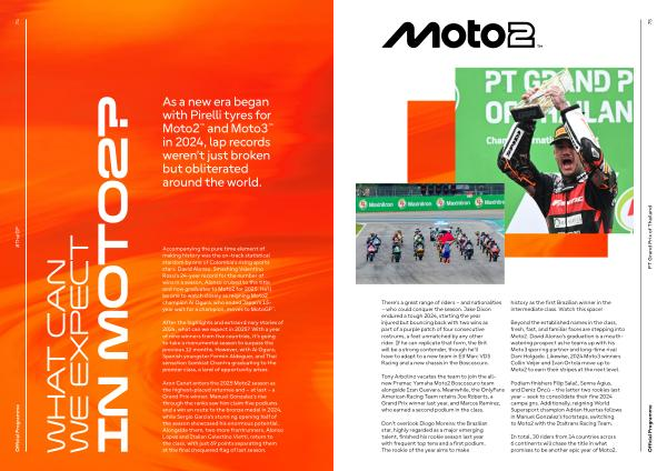 As a new era began with Pirelli tyres for Moto2™ and Moto3™ in 2024 , lap records weren ’ t just broken but obliterated around the world . Accompanying the pure time element of making history was the on-track statistical stardom by one of Colombia ’ s rising sports stars : David Alonso . Smashing Valentino Rossi ’ s 24-year record for the number of wins in a season , Alonso cruised to the title and now graduates to Moto2 for 2025 . He ’ ll be one to watch closely as reigning Moto2 champion Ai Ogura , who ended Japan ’ s 15- year wait for a champion , moves to MotoGP™ .