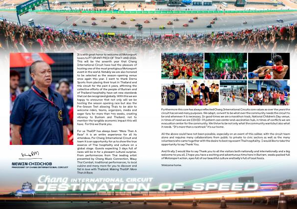 It is with great honor to welcome all Motorsport lovers to PT GRAND PRIX OF THAILAND 2026. This will be the seventh year that Chang International Circuit have had the pleasure of hosting one of the most prestigious Motorsport event in the world. Notably we are also honored to be selected as the season-opening venue once again this year. I want to thank Dorna Sports from placing their trust in Thailand and this circuit for the past 6 years, affirming the collective efforts of the people of Buriram and of Thailand hospitality have set new standards that can be recognized globally. With this we are happy to announce that not only will we be hosting the season opening race but also the Pre-Season Test allowing Thais to be able to welcome riders, teams, organizers, media and eager fans for more than two weeks, creating vibrancy to Buriram and Thailand, not to mention the tangible economic impact this will have. For this we thank you. newin chidchob president of chang international circuit