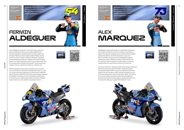 Promotion to MotoGP™ followed in 2020, where Marquez impressed with back to back second place finishes. Challenging seasons with Honda followed, before a career turning point arrived with a switch to Ducati machinery in 2023. Podiums and Sprint success confirmed renewed form, which accelerated in 2025. Three Grand Prix victories marked a landmark season and placed Marquez firmly among the elite. Entering 2026 on equal machinery to the title favourites, Marquez targets his first MotoGP™ crown.