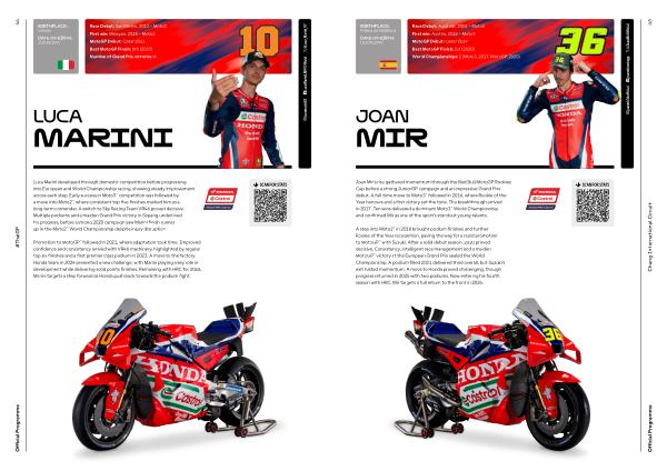 A step into Moto2™ in 2018 brought podium finishes and further Rookie of the Year recognition, paving the way for a rapid promotion to MotoGP™ with Suzuki. After a solid debut season, 2020 proved decisive. Consistency, intelligent race management and a maiden MotoGP™ victory at the European Grand Prix sealed the World Championship. A podium filled 2021 delivered third overall, but Suzuki’ s exit halted momentum. A move to Honda proved challenging, though progress returned in 2025 with two podiums. Now entering his fourth season with HRC, Mir targets a full return to the front in 2026.