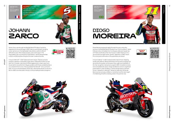 A move to Moto2™ in 2024 marked another step forward. Adapting quickly with Italtrans, Moreira delivered a strong rookie campaign and secured his first podium at the season finale, again earning Rookie of the Year recognition. Momentum surged in 2025. Consistent victories and a remarkable late season charge saw Moreira overturn a significant points deficit to claim the Moto2™ World Championship in dramatic fashion. Graduation to MotoGP™ follows for 2026 with LCR Honda. Moreira arrives carrying confidence, momentum and the clear target of establishing himself as a leading rookie in the premier class.