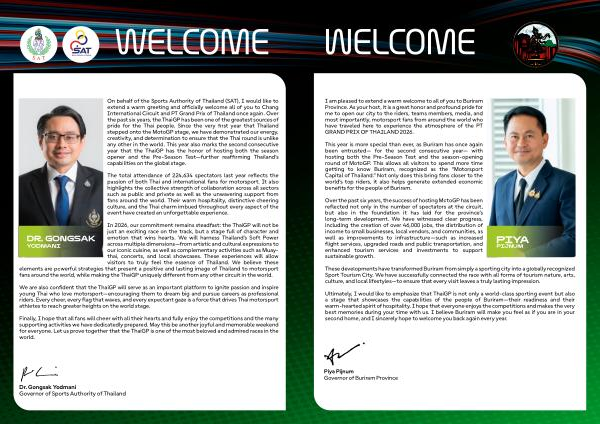 On behalf of the Sports Authority of Thailand( SAT), I would like to extend a warm greeting and officially welcome all of you to Chang International Circuit and PT Grand Prix of Thailand once again. Over the past six years, the ThaiGP has been one of the greatest sources of pride for the Thai people. Since the very first year that Thailand stepped onto the MotoGP stage, we have demonstrated our energy, creativity, and determination to ensure that the Thai round is unlike any other in the world. This year also marks the second consecutive year that the ThaiGP has the honor of hosting both the season opener and the Pre-Season Test— further reaffirming Thailand’ s capabilities on the global stage.