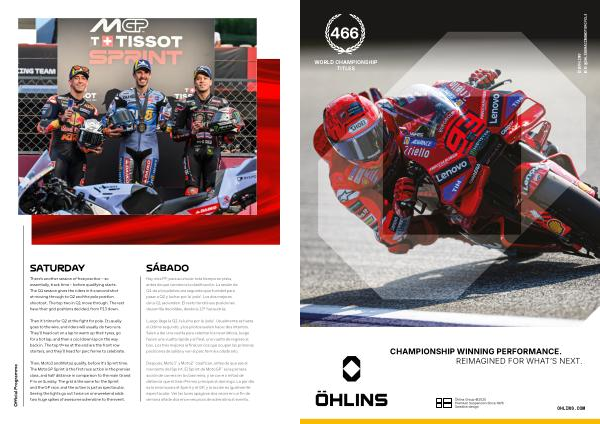 Después, Moto3™ y Moto2™ clasifican, antes de que sea el momento del Sprint. El Sprint de MotoGP™ es la primera acción de carrera en la clase reina, y se corre a mitad de distancia que el Gran Premio principal el domingo. La parrilla es la misma para el Sprint y el GP, y la acción es igualmente espectacular. Ver las luces apagarse dos veces en un fin de semana añade dos enormes picos de adrenalina al evento.