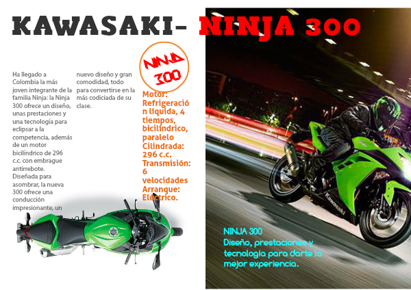 Ha llegado a Colombia la más joven integrante de la familia Ninja: la Ninja 300 ofrece un diseño, unas prestaciones y una tecnología para eclipsar a la competencia, además de un motor bicilíndrico de 296 c.c. con embrague antirrebote.