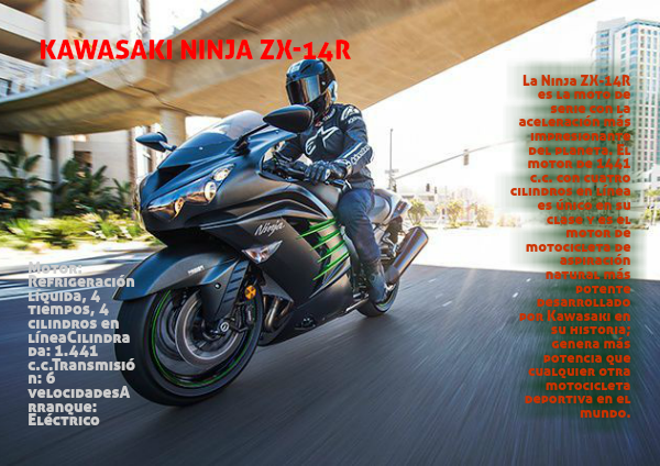 La Ninja ZX-14R es la moto de serie con la aceleración más impresionante del planeta. El motor de 1441 c.c. con cuatro cilindros en línea es único en su clase y es el motor de motocicleta de aspiración natural más potente desarrollado por Kawasaki en su historia; genera más potencia que cualquier otra motocicleta deportiva en el mundo.