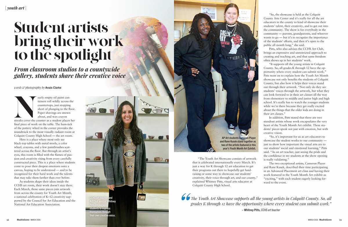 “ It supports all the young artists in Colquitt County. So, all grades K through 12 have the opportunity where every student can submit work.” Pitts went on to explain how the Youth Art Month showcase not only benefits the students of Colquitt County, but also how it helps their voices stand out through their artwork.“ Not only do they see students’ voices through the artwork, but what they can look forward to in their art classes all the way from elementary to middle and junior high and high school. It’ s really fun to watch the younger students while we’ re there because they get really excited about the things that the older kids are doing in their art classes.”