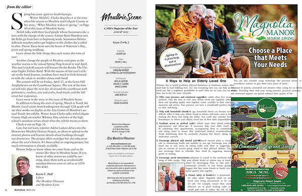 The concert will be on Friday, April 17, at the Lewis Hill Amphitheatre on the Courthouse Square. The rest of the festival will take place the next day all around the courthouse with performers, vendors, arts and crafts, food trucks and the full street fair experience. Learn more in the story in this issue of Moultrie Scene. In addition to being the start of spring, March is Youth Art Month. Local artists from kindergarten through 12th grade will see their works on display at the Arts Center of Moultrie’ s annual Youth Art exhibit. Writer Anais Clarke talks with Colquitt County High art teacher Whitney Pitts and two of the high school’ s standout artists about what the exhibit means to them. Check it out on Page 32. Last, but not least, reporter Adelia Ladson delves into the Downtown Moultrie History Project, an effort to upload to the internet photos and historic details about buildings throughout downtown. The project offers nostalgia but also education about the area’ s history. It’ s been called an ongoing project, but much information is already available.