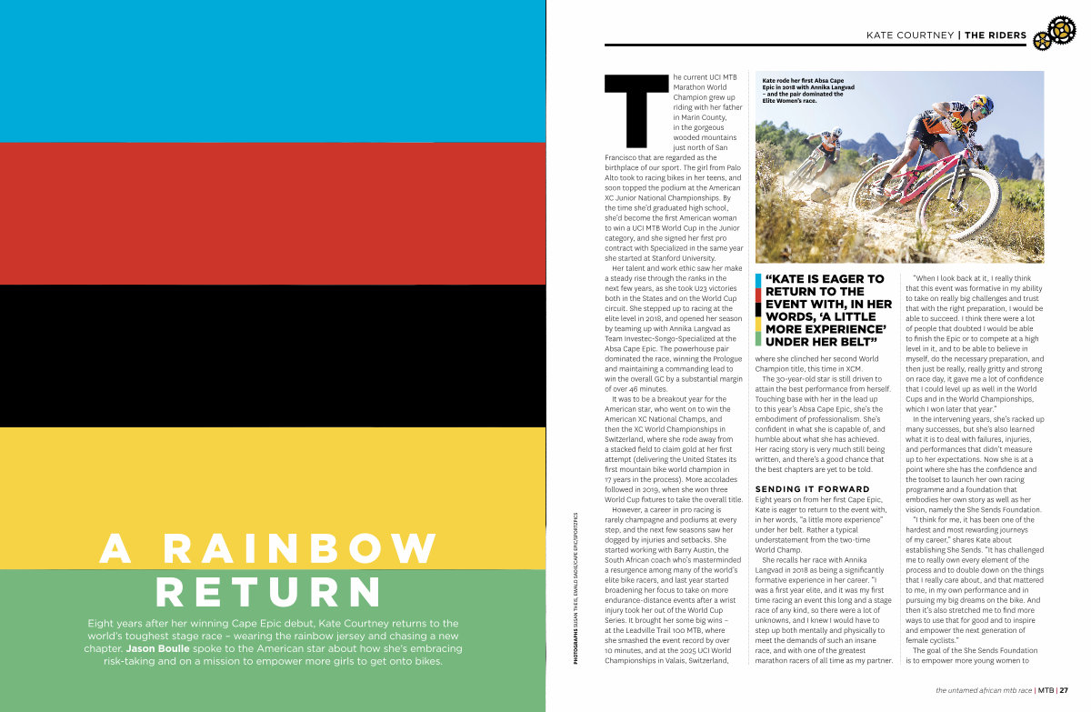Eight years after her winning Cape Epic debut, Kate Courtney returns to the world’ s toughest stage race – wearing the rainbow jersey and chasing a new chapter. Jason Boulle spoke to the American star about how she’ s embracing risk-taking and on a mission to empower more girls to get onto bikes.