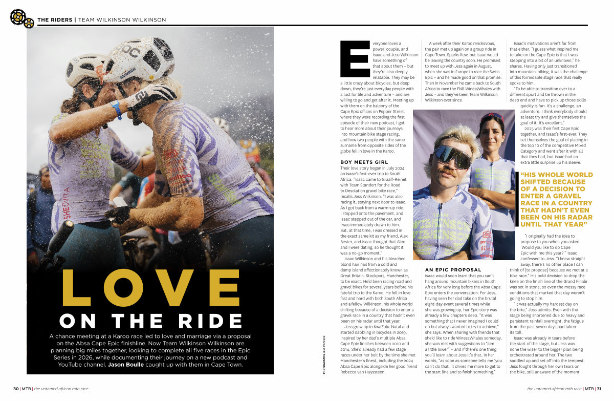 veryone loves a power couple, and Isaac and Jess Wilkinson have something of that about them – but they’ re also deeply relatable. They may be a little crazy about bicycles, but deep down, they’ re just everyday people with a lust for life and adventure – and are willing to go and get after it. Meeting up with them on the balcony of the Cape Epic offices on Pepper Street, where they were recording the first episode of their new podcast, I got to hear more about their journeys into mountain bike stage racing, and how two people with the same surname from opposite sides of the globe fell in love in the Karoo.