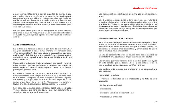 En la actualidad la mayoría de los católicos saben muy poco o nada acerca de las causas emocionales de la inclinación y conducta sexual. El fracaso de la terapia tradicional es lograr el mismo objetivo; las opiniones son diversas entre especialistas y universidades de que la homosexualidad no es un desorden.