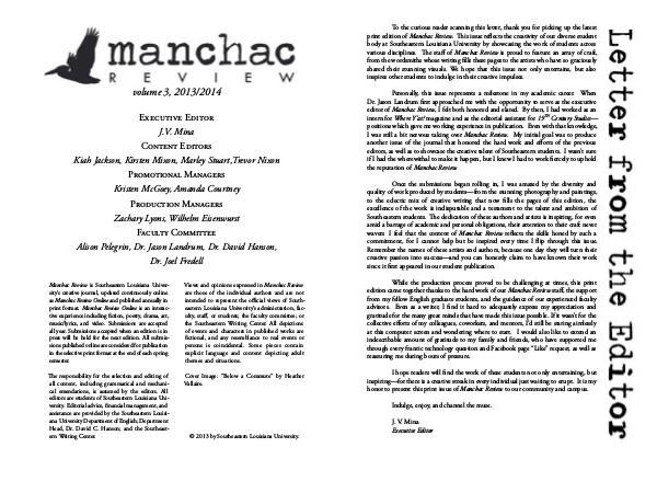 edition came together thanks to the hard work of our Manchac Review staff, the support