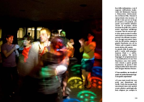 fase della realizzazione, e con il supporto dell’ Archivio Audiovisivo del Movimento Operaio e Democratico( www. aamod. it) e di Kinesis Film. Durante le riprese durate circa un anno – il 4stelle è stato per noi un luogo di incontro e di passione, per questo con il webdoc abbiamo cercato di raccontare alcuni momenti di quella che è stata la nostra esperienza nell’ albergo occupato. Non ho ancora capito bene quale sia stato il confine tra le riprese e la relazione con le persone che abbiamo incontrato e che oggi sono amici. Spero solo che dal webdoc emerga la grande franchezza con cui io, Valerio e gli occupanti ci siamo messi attorno alla camera. La grande sfida di questo progetto è anche nella programmazione Html 5 e nell’ interfaccia grafica. Un nuovo linguaggio di programmazione e la pianificazione di una User Experience sono state un’ ulteriore stimolo a questo grande esperimento. In questo è stato indispensabile l’ aiuto del nostro web-designer Martino Bresin ».