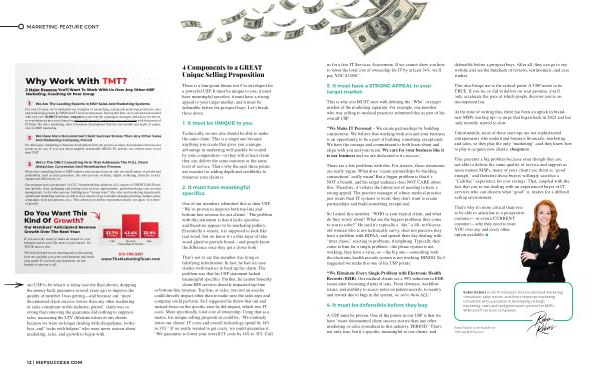our USP to be what it is today( see the flyer above), dropping the money-back guarantee several years ago to improve the quality of member I was getting— and because our“ more documented client success stories than any other marketing or sales consultant in this industry, period” claim was so strong that removing the guarantee did nothing to suppress sales, increasing the LTV( lifetime value) of our clients because we were no longer dealing with cheapskates, lookyloos, and“ techs with helpers” who were never serious about marketing, sales, and growth to begin with.